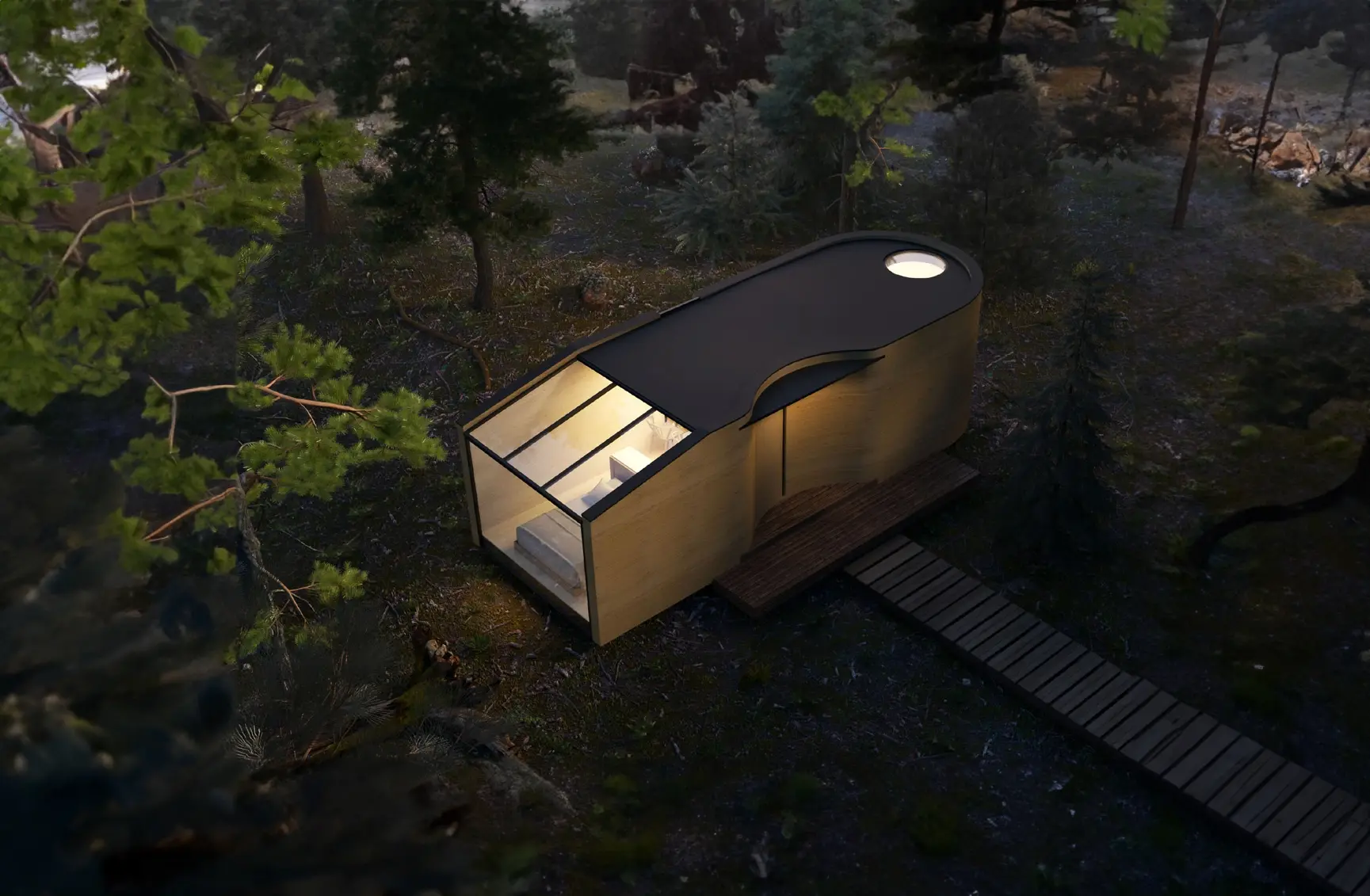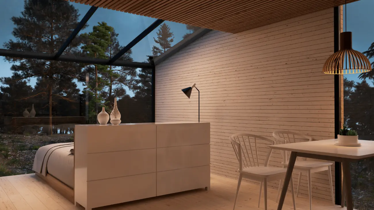 Putiikki aamupala sänkyyn -konsepti - hevoset, metsä, marjastus ja sienestys. WLT-asennus paikan päällä kappaleittain, seinät 200mm, mänty